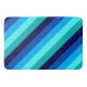 Una gran alfombra de baño con un diseño de patrón fresco de rayas diagonales en azul marino, azul cobalto, azul celeste, verde azulado de menta helada y turquesa clara.