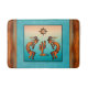 Cuenta con un Kokopelli del Suroeste que toca la flauta y baila alrededor de un actus bajo el sol sobre un fondo turquesa... ¡Rodeado por un borde de cobre!
