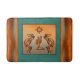 Cuenta con un Kokopelli del Suroeste que toca la flauta y baila alrededor de un actus bajo el sol sobre un fondo turquesa... ¡Rodeado por un borde de cobre!