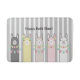 El diseño del producto incluye un ilustracion de 5 llamas decoradas de forma retro y colorida. Este adorable diseño animal con rayas blancas hace una alfombra de baño moderna y única con texto personalizado y color de fondo para el baño de las niñas.