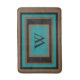 Monograma inicial en el centro en tipografía negra. Patrón de bloques geométricos. verde verde azulado con rectángulos marrones y negros. Diseño original de TamiraZDesigns.