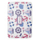 En esta colorida alfombra de baño se observa un divertido patrón náutico. Las imágenes del patrón incluyen estrellas de mar, conchas, una rueda de barco, un ancla, un cartel y un velero. El patrón azul marino, azul medio y rojo se coloca sobre un fondo blanco. El nombre de su hijo está en un cartel blanco que está alineado con el rojo y el azul, y situado en el centro.