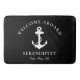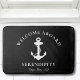Una moderna alfombra de baño negra de temática náutica de moda para el barco que cuenta con un ilustracion blanco de ancla. Puede personalizar el texto y el monograma de "Welcome Aboard" con el nombre y la ubicación de su barco en una elegante tipografía blanca.