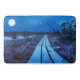 Vista panorámica de la ciudad de bog por la noche con sendero de madera, pequeños estanques y pinos. Camino de senderismo con pasarela de madera que atraviesa el pantano contra luna llena y cielo nocturno con estrellas