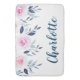 Elegantes rosas rosas rosas y hojas azules diseño acuarela con texto de personalizable para un nombre o monograma en una alfombra de baño.