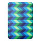Una gran alfombra de baño con un diseño colorido y sombrío de chevrones en verde limón, azul turquesa real, azul océano y azul cielo.