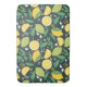 Una alfombra de baño adorable con limones amarillos y frutos de cal verde con tallos de hojas sobre un fondo verde oscuro.