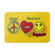 This Peace, Love & Happiness bath mat features playful icons — peace sign, heart, and smiley — on a warm golden yellow background designed to brighten any bathroom space.