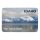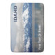 Mirando al este desde Sandpoint, ID a través del lago Pend Oreille (charca uh-ray) en un día de invierno; montañas cubiertas de nieve a lo lejos. El hielo se ha formado en la orilla y se extiende a lo largo del lago. El azul y el gris son los colores predominantes. También aparece el texto "IDAHO". Y es un lugar para agregar texto adicional.