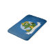 Diseño con un ilustracion de cabeza de un lindo dragón verde sosteniendo un huevo dorado, diseño en círculo azul sobre fondo azul; diseño de cuentos de hadas y fantasías para los niños; con la plantilla de texto de personalizable para su nombre o mensaje