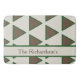 Transform your bathroom floor with this customizable sage green and taupe triangle bath mat featuring your personalized family name. The sophisticated geometric pattern with alternating triangular shapes in soft sage green outlines and warm taupe fills on clean cream background creates a modern, Scandinavian-inspired focal point while adding comfort and safety. Your family name is beautifully displayed in taupe serif typography on a cream ribbon banner with sage green accents. Personalize with your surname to complement your bathroom style. Soft, plush microfiber surface feels luxurious underfoot and quickly absorbs water after showers or baths. Non-slip backing keeps mat securely in place on tile, linoleum, or wood floors for added safety. The calming color palette adds tranquility and modern elegance to master bathrooms, guest baths, spa-inspired bathrooms, or powder rooms while coordinating with sage green, taupe, cream, white, or natural wood tone towels and accessories. Durable construction withstands high-traffic use and frequent washing. Quick-drying material prevents mildew and odors. Machine washable for easy maintenance. Available in multiple sizes. Perfect personalized bathroom update or gift.