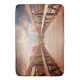 Una alfombra de baño con una fotografía panorámica. Un puente de madera que conduce a un camino rodeado de árboles que cambian de color.