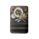 Diales antiguos con artes de oro y latón, decorados con libélula mecánica sobre fondo marrón, rayado. Steampunk.
