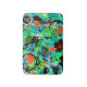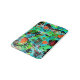 Un abstracto animado en tonos turquesa, verde azulado, naranja, naranja rojo, negro, blanco, oro metálico y tonos verdes.