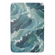 Una representación de las turbulentas olas del mar, creada digitalmente, en varios tonos azules y verdes, con resaltados blancos, simula los escudos espumosos del agua. El estilo estilizado de las olas da una sensación de movimiento y la intrincada capa de colores añade profundidad al tema acuático.