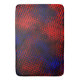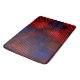 Riscos vermelhos com tons mais claros e escuros que foram cruzados e passados em filtro que os modificou de maneira que não se percibe mais serem riscos, mas, parecem formatos quase quadradas sobre um fundo azul, podendo causar una percepción de profundidade no azul.