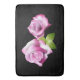 Dos rosas rosas rosas perfectas sobre un fondo negro.