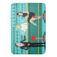 Cada hora es feliz con este salón de cócteles retro Bath Mat. El diseño moderno de mediados de siglo presenta un vibrante estilo de los años 60, minimalista y personalizado de un elegante bar de cócteles. En el fondo de una pared acuática, se pueden ver filas de vasos de bebida. Al menos podemos ver las siluetas verde azuladas de los vasos de bebida. A juzgar por las formas de los tallos, este bar está bien equipado para mojar tu silbato, sea cual sea tu preferencia por la bebida. Un camarero muy competente y muy agradable se encarga del bar verde azulado con acentos amarillos. El joven camarero lleva una camisa blanca y prístina con corbata de arco negro. Su buena apariencia de cara fresca, su pelo rubio y sus gafas de hipster negro nos dan todas las razones para creer que pasa sus días como actor en dificultades o superhéroe. Por un lado, el guapo mixólogo está entregando un martini a un cliente del lado opuesto del bar. El cliente que espera es un caballero de hombros anchos con un traje negro y corbata roja. Es el tipo de tipo que se describe como alto, oscuro y guapo incluso cuando faltan horas para la hora de cierre. Parece haber un taburete rojo y cromado con el nombre del señor Debonair. Sin embargo, para no ser presuntuoso, se pregunta: "Perdóname. ¿Está ocupado este asiento?" Le está pidiendo a la chica de pelo cuervo en el taburete del bar vecino. Ella es una verdadera "chica de al lado", si resulta que vives al lado de una belleza impecable con una figura que no renunciará. Lleva puesto un vestido negro y sostiene un martini en una mano. Ella espera que ella y el caballero que se acerca tengan más en común que su preferencia por la bebida y la elección del color del armario. Parece que esta noche se puso interesante. ¡Salud!
