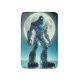 Sasquatch se encuentra bajo una luna llena rodeada de montañas, revelando una exposición de titanio de circuitos electrónicos y luces LED.
