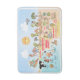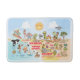 Una escena luminosa y colorida ofrece una vista espectacular del sur de California - personajes extravagantes de la playa y el desierto de SoCal mostrando Los Ángeles, San Diego, Condado de Naranja, Santa Bárbara, Riverside, Palm Springs, Anza Borrego y los parques de árboles Joshua Tree, así como las ciudades fronterizas de Tijuana, Tecate y Mexicali. Esta encantadora escena lo tiene todo - un surfista cuelga diez mientras una ballena asesina salta del agua, animales del zoo saludan a los turistas, una pareja de playa muscular flex para impresionar mientras un T-Rex ruge un desafío y un tanque se mueve en posición y mucho más...