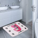 This bath mat has two sophisticated cats wearing diamond collars, one black and one white, sitting in a mid century style pink chair on a white background with pink dots. Customise your text with the template.