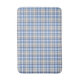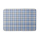 Esta alfombra de baño presenta un patrón de tartán colorido (plaid) en blanco, azul y gris parduzco (taupe).