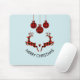 Un mousepad que dice "Feliz Navidad" en texto curvo. Diseñado con un ilustracion de 2 ciervos Navidades saltando. Los ciervos están hechos de leñadores rojos y negros, con un poco de corazón entre ellos. Las decoraciones de Navidad rojas y negras se cuelgan desde arriba.