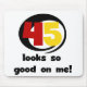 Si usted o alguien que usted conoce cumple 45 años, le encantarán nuestras camisetas de cumpleaños 45 Looks So Good On Me, botones, tarjetas, pegatinas, tazas, imanes y otras prendas de cumpleaños 45 con un diseño de texto negro, rojo y amarillo.