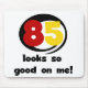 Si tú o alguien que conoces cumple 85 años, te encantarán nuestras camisetas de cumpleaños 85 Looks So Good On Me, botones, tarjetas, pegatinas, tazas, imanes y otras prendas de cumpleaños 85 con un diseño de texto negro, rojo y amarillo.