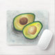 Pintura acuarela de un aguacate verde fresco cortado a la mitad. Fondo moteado gris y azul.