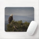 Águila calva madura sentada en un árbol de flores con la isla de Vancouver al fondo.