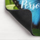 Almohadilla de ratón personalizado con fondo de foto de mariposa morfo azul tropical. Tipografía clásica de guión de broche e imagen de fondo exótica. Elegante regalo de tabique. Monogramado con su nombre, letras iniciales o apellido. Idea de regalo de vacaciones o cumpleaños para amigos, familia, madre, abuela, esposa, hija, chica, hermana, etc. Accesorios de ordenador personalizado con una hermosa fotografía macro-naturaleza.