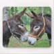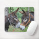 Una foto de dos burros grises marrones amistosos que tocan narices con un fondo de la hierba y de los árboles. Parecen muy lindos con sus oídos delanteros y los anillos blancos alrededor de sus ojos apacibles. La fotografía fue tomada en una demostración en Francia donde están muy populares los burros.