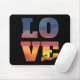 ¡Una playa tropical es el lugar perfecto para el amor! Hermosa almohadilla de ratón de efecto de texto knockout con letras apiladas de la palabra AMOR. Una colorida escena de atardecer tropical con palmeras en la silueta se ve a través de las letras en bloque sobre fondo negro.