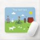 Cute mousepad / mousemat con animales personalizados (cabra, burro, mariposa, perros y cachorros persiguiendo a un gato) y un chico montando una bicicleta. Personalizar el texto para adaptarlo a tus necesidades haciendo clic en el botón "Personalizar" - montones de colores y fuentes para elegir.