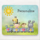 Mousepad/mousemat coloridos lindos con un ilustracion caprichoso adorable del vector del dibujo animado de una jirafa linda, del mono, del elefante y de una niña en un tren bonito con los corazones y las estrellas en un fondo del verano de la hierba verde y del cielo azul con un sol amarillo bonito. ¡Las mujeres, los niños y los chicas de todas las edades amarán estos animales felices de la diversión!