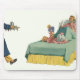 Ilustración antigua diseño de vacaciones del Día de la Madre con el papá sirviendo el desayuno en la cama mientras mamá está cotilleando por teléfono y su hija está jugando con una muñeca en su cama.