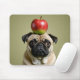 Gracioso Pug con una manzana balanceándose encima de su cabeza.