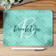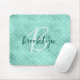 This elegant personalized mouse pad features a monogram and first name in modern script on a background pattern of aqua blue faux foil mermaid or fish scales.