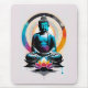 Una estatua de Buda está sentada en medio de un colorido círculo zen, con una flor de loto.