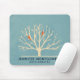 Un mousepad personalizado con su nombre y título. Un árbol amarillo claro con dos siluetas de pájaro naranja sobre las ramas está diseñado con un fondo verde y mudo.