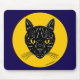 A retro-looking illustration of the face of a yellow-eyed black cat appears in a moon-like circle in this original Halloween-appropriate art by Richard H. Fay.