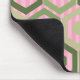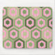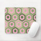 Esta almohadilla del ratón tiene un diseño geométrico de hexágonos en cuatro tonalidades de verde sobre un campo de rayas rosas en dos sombras.
