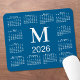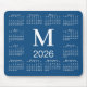 Minimal calendar mouse pad features a white 2026 calendar on a blue background with a bold custom monogram above the year in the middle. Add your initial in the sidebar.