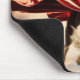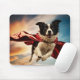 A mousepad featuring a Border Collie superhero with a scarlet cape flying in blue skies.