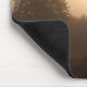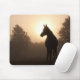 Silhouette de caballo noble árabe contra el amanecer a través de la niebla pesada, en sepia