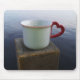 Taza en forma de corazón deliciosa de café con un lago tranquilo en el fondo