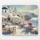 Perfecto regalo para los amantes del viaje y del café. El cuadro acuático representa el encanto tranquilo e idílico de una cafetería al aire libre de Santorini. El espacio está decorado con paredes encaladas con acentos azules y aberturas abovedadas que ofrecen unas vistas impresionantes al brillante mar Egeo. Mesas de madera con sillas de mimbre dispersas por todas partes, cada una de ellas adornada con jarrones de flores de buganvillas vibrantes. Un mostrador de piedra natural ofrece una cafetera tradicional griega, bollería y una cafetera espresso de época. En la parte superior, una pérgola de madera recubierta de viñas exuberantes ofrece una sombra parcial, lo que crea una luz solar dilatada en el suelo de baldosas de piedra. Los clientes se sientan con tranquilidad, tomando café y mirando al mar o conversando en silencio. Los icónicos colores blanco y azul de Santorini armonizan maravillosamente con la belleza natural del paisaje de los alrededores.