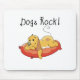 Un lindo perro marrón se relaja alegremente en su cama de cachorro y el texto negro dice "¡Roca de perros!" en nuestras camisetas de Roca de Perros, tazas, ratones, botones, tarjetas y más!