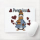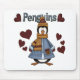 Camisetas, caramelos, tarjetas, pegatinas, imanes, mousepads, bolsos y otras prendas de amante de los pingüinos con un pingüino vestido con traje de invierno rodeado de muchos corazones rojos.